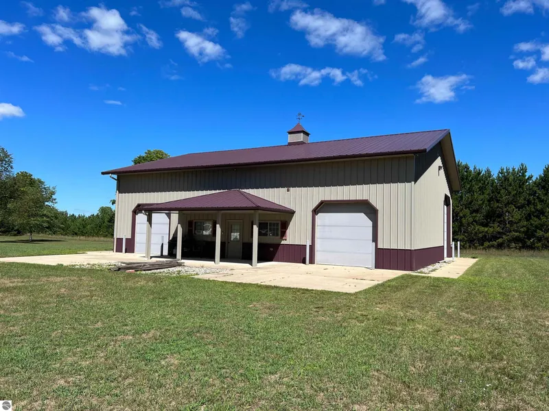 48' X 60' Morton building with 460 sq. ft. of finished space with kitchen, full bathroom and washer/dryer on 10 acres offering two 30 AMP powered camping hookups with water. Very private parcel resembling a park-like setting combined with hardwoods. Also, this could be a Barndominium concept. (Buyer would need to apply for a permit after closing to allow for overnight sleeping through Kalkaska County). Fully insulated with white, steel linen panels throughout. Deluxe LED interior/exterior lighting package. 16' side walls. Two 12' wide X 14' tall insulated overhead doors with automatic openers. Two 10' wide X 10' tall insulated overhead doors with automatic openers. 50 AMP outlet to plug in your RV or boat. Covered patio. Security cameras available for future hook up. Property is accessed by a well maintained, hard packed gravel easement off of M-72 and is situated ideally to offer a very...