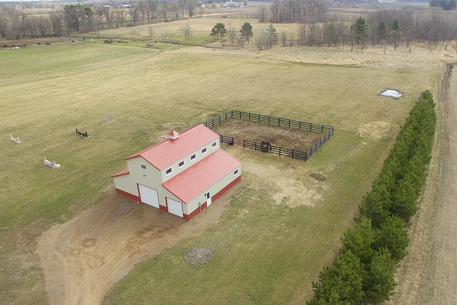 Welcome to nearly 20 acres of bliss. Pole barn with studio living in upper level offers a modern and classy place to stay when you aren't outside to play! The rain shower in the bathroom is the perfect place to relax, the laminate floors and natural light speak to your soul. At ground level, a box stall is set up if you have animals and the pole barn offers storage and space galore! Outside is a 50x80 corral, then a cabin in the woods and a bridge across a creek. Storybook perfection!