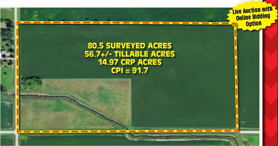 80.5 Surveyed Acres, 56.7+/- Tillable Acres, 14.97 CRP Acres