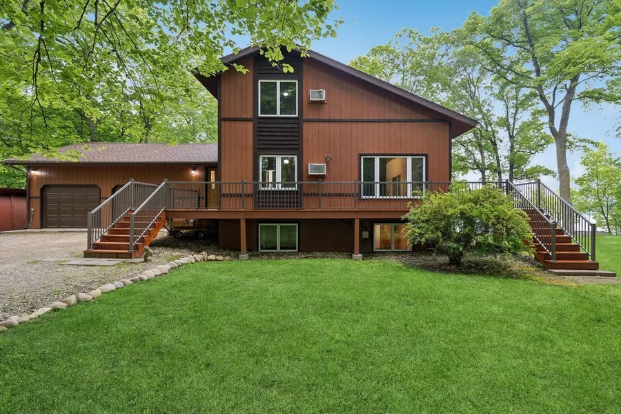 Tucked into 1.5 wooded acres along the shores of Nest Lake, this private retreat offers a rare combination of seclusion, updated living spaces, and exceptional outdoor amenities. The home features vaulted ceilings with warm wood accents, newly updated maple hardwood floors, and a remodeled kitchen complete with granite countertops, stainless steel appliances, and a redesigned pantry for added storage and convenience. A wood-burning fireplace anchors the main living area, creating a cozy space with large windows that frame lake and woodland views. The main level includes the primary bedroom and a full bath with jetted tub. The upper-level has two bedrooms with a walk through bath and features a loft area that provides versatile space ideal for an office, reading nook, or library. The lower level adds a family room with a gas-burning stove, a wet bar rough-in, and additional sleeping space...