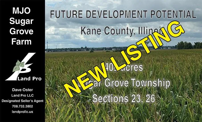This 40-acre property lies in the path of progress. Situated near infrastructure facilities allowing for the fu-ture development of single-family homes. The gentle south facing slope could easily accommodate the de-velopment of a community solar farm and other green initiatives. Subdivision Concept Plan available. Survey available. Sections 23 & 26, Sugar Grove Township, T.38N.-R.7E., Kane County IL. Adjacent to Aurora IL corp limits. Dave Oster, Broker