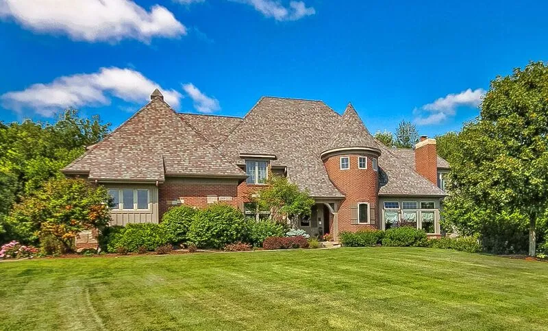 Architecturally stunning French Normandy in THREE LAKES! 5200 sq. ft. w/expansive turret/copula. Tumbled brick/ stone exterior, 1st floor Master Suite w/tray ceiling; crown molding t/o; oak-drenched library w/Judge's paneling; kit w/Brazilian granite counters, newer SS appliances; new dishwasher; 5 BRs; bonus rooms; large custom brick patio w/fire pit; beautifully landscaped 1.3 acres; garden area; mature trees in back; private back setting, full English basement
