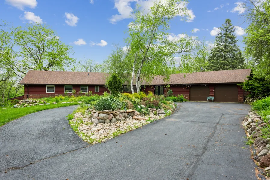 Over $100,000 in recent improvements. This mid century ranch has been updated. This sprawling ranch has 5 bedrooms (all on main level-one can be used as an office), 4 baths (3 baths on main level) & 4 car garage. Located on 2+ acres with mature trees, property line ends at Tyler Creek. Partially finished walkout basement with rec room with fireplace, additional full bath (needs updating), workshop, bonus space and access to 3rd and 4th garage. New roof 2019, new AC and Furnace 2021. New kitchen 2022 with quartz counters, light grey cabinets, subway tile backsplash, new stainless steel stove and microwave and new windows. 3 new main floor baths-new primary bath almost finished. Brand new commercial grade vinyl/laminate flooring thru the main level & primary bedroom. Dining room has vaulted ceilings with original wood horizontal shiplap, living room has vaulted ceiling with skylight, freshly painted & deck to yard. Original wood horizontal shiplap in bedrooms 2 thru 5 with original hardwood floors. New front door. Large primary bedroom with sliding glass doors to deck, new ensuite and fireplace with custom built-ins. 4 car garage-2 car attached on main level, 2 car attached on lower level. Horseshoe driveway with additional side driveway, plenty of parking for your RV, boat or both. Perfect for contractors or construction business. Convenient 1st floor laundry room with extra cabinets/storage. Gorgeous private backyard on 2+ acres with mature trees all the way back to Tyler Creek. Watch the deer and fox play! City water and sewer. Chicken coop already waiting for you! Good bones but Sold as-is. Close to shopping, train and I90.