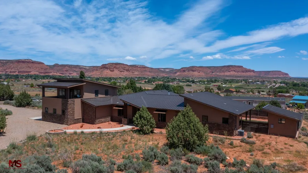 Eye-catching, spectacular home on the corner of Kane & Powell Drive. A home that will give you the sun, moon, and stars. This newer construction custom home is located in the highly desirable Kanab Creek Ranchos Subdivision on over 2 acres and it has every viewpoint of sun and moon rise, sun and moon set, the red cliffs, and Kaibab. Covered patio off the main bedroom & Great Room. Extraordinary large laundry room with many cabinets and a sink. The great room is open to the kitchen and dining area with a wood fireplace surrounded by natural rock and built-in shelves. Vaulted ceilings in living room and kitchen. 1363 sf garage with plenty of workspaces, plus a separate detached art studio on the south. There is an upper unit with a kitchenette and bathroom, a covered patio, and a separate entrance from the yard or the garage, which also includes a split unit heat and cooling system. This m...