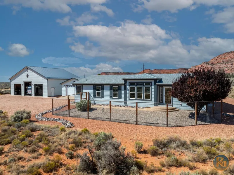 Here's your next dream property! Updated home with red rock views, 6.74 acres PLUS a 2,000 square foot shop. This home has been impeccably maintained. Recent upgrades include: Quartz countertops, Moen fixtures, HVAC condenser, smart thermostat, new water heater, light fixtures, blinds, and ceiling fans. The home is oriented for direct views of the red rock cliffs has an open floor plan. Interior features include high vaulted ceilings, built-in entertainment center, large kitchen island/breakfast bar, pergo floors, stainless steel kitchen appliances, and large tinted windows with stunning views from every room. The upgrades continue outside with an enclosed fenced-in front and backyard with decorative rock landscaping. All fencing has "snake guard" protection to keep pets & kids safe. The backyard has a covered cement patio, fire pit, new gravel, and two mature high producing fruit trees (peach and apple). Park in the standalone 2-car garage, and enjoy the NEW 50' W x 40' L three-bay shop with pull through bays: two 10' bays, one 12' RV bay. With all that acreage; there's still plenty of space for corrals, barns, and/or another home site! (Buyer to verify all)