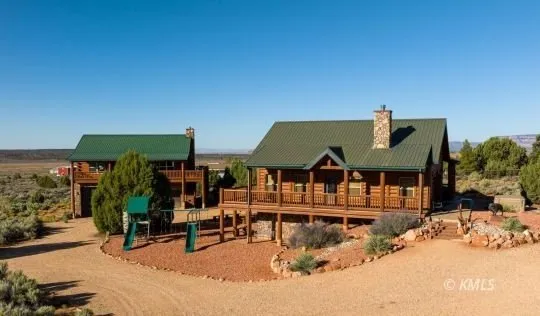 Your dream property is finally available! This remarkable estate offers TWO separate homes on 2.22 acres, zoned for horses, just east of Kanab City. Complete with a perfect blend of rustic charm, modern convenience, and stunning red rock views. The main Home is a 3,052 sq. ft. handcrafted log cabin with 4 bedrooms / 3 bathrooms, includes a custom-designed bunk room. Inside, soaring vaulted ceilings and rich log details create a warm, western-inspired atmosphere. Step out onto wraparound deck for panoramic views of Kanab's famous red cliffs. Sold fully furnished and turnkey, this home is already operating as a successful short-term vacation rental. The 2nd Home is a 1346 sq. ft. with 2 bedrooms, loft, and 2 bathrooms. Perched above a well-maintained 1,259 sq. ft. 2 car/RV garage. Multiple decks with stunning views. It comes partially furnished and ready for immediate use. Located between Zion Nat'l Park, Bryce Canyon, Grand Canyon's North Rim, Lake Powell, and the renowned Best Friends Animal Sanctuary. This estate is truly a one-of-a-kind home base. This property can be a lifestyle, an investment, and an extraordinary opportunity to own a rare gem in Kanab. Buyer to verify all.