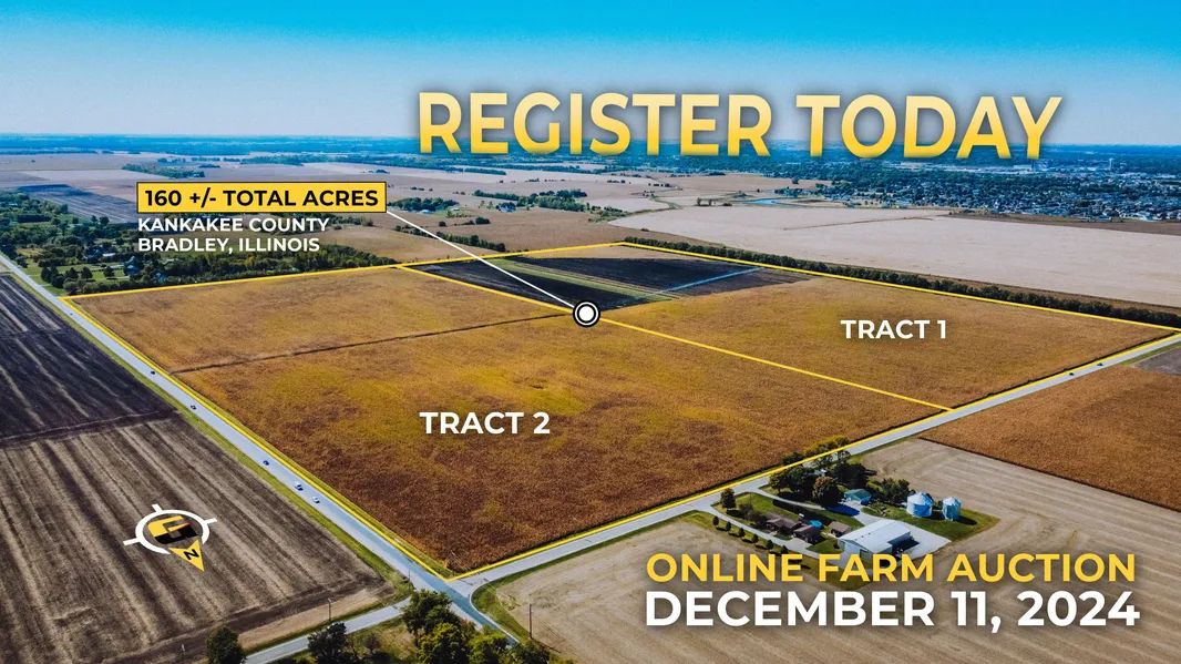 Join us for a farm auction on December 11, 2024, where we are offering two tracts of land located at the corner of E 4000 N Rd and N 4000 E Rd, conveniently situated just east of the Bradley city limits. This property boasts +/- 153.9 acres of FSA Crop Acres, featuring a productivity index of 120.4 - an excellent investment for agricultural use. Additionally, there may be potential develop-ment opportunities worth investigating. Please note that irrigation pivots, pumps, and above-ground piping are not included in the sale of the real estate, though the purchase of irrigation equipment can be negotiated separately. Confidential offers & private sale will be considered prior to auction.
