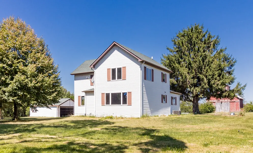 Large three bedroom Farmhouse on a full basement set back off the road SITTING ON 2 ACRES! Detached garage and barn can house your supplies and friends for all-day get togethers. Nothing but a large field in the back. Large open kitchen opens to large living room. Plenty of open space and light! All the big ticket items have been addressed and the home is move in ready with new paint, floors, septic, and roof. Plenty of room inside and out!
