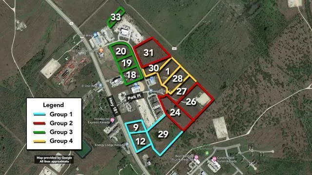 Auctions: 12:30 PM 11/8/2019 Nominal Opening Bid: SELLS WITHOUT RESERVE. Seller Chosen Auction. 55.32+/- ac located in an Opportunity Zone just minutes outside of downtown Kenedy on Hwy 181 and less than 2 hours away from San Antonio and Austin. Available utilities and sufficient sizes to permit various types of commercial development. Lots will be sold in buyer's choice groups so bid early and bid often to take one, some, or all. Buyer's Choice Group 1 Tract 9 - 2.5+/- ac with frontage on Hwy 181 Tract 12 - 3.84 +/- ac with frontage on Hwy 181 Tract 29 - 10.89 +/- ac Buyer's Choice Group 2 Tracts 24 - 7.13 +/- ac Tract 26 - 10.39 +/- ac Tract 31 - 8.02 +/- ac Buyer's Choice Group 3 Tract 18 - 3.23 +/- ac Tract 19 - 2.93 +/- ac Tract 20 - 3.59 +/- ac Tract 33 - 1.8 +/- ac. Buyer's Choice Group 4 Tract 1 - 4.8+/- ac Tract 27 - 4.812 +/- ac Tract 28 - 4.8 +/- ac Tract 30 - 3....
