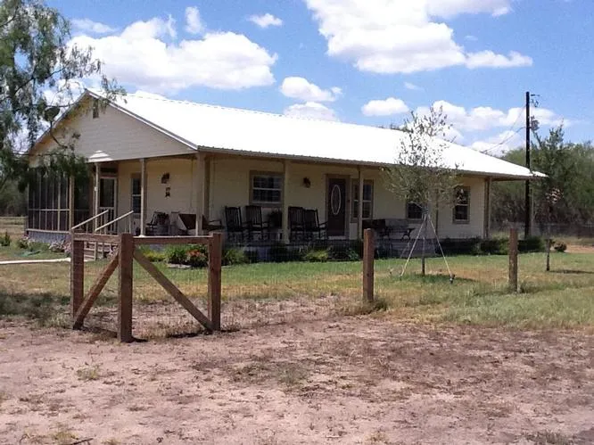 40 Acres with 2 year old custom built home just minutes from downtown Kenedy. This comfortable 2 bedroom, 2 bathroom home has a wonderful open floor plan where the family room, dining room and kitchen all overlook each other. High ceilings make this country home feel so much larger than it's 1364 sq. ft. Rustic flooring & counter tops are just some of the amenities. Wrap around porches, screened patio, storage shed and small guest house just add to the appeal.