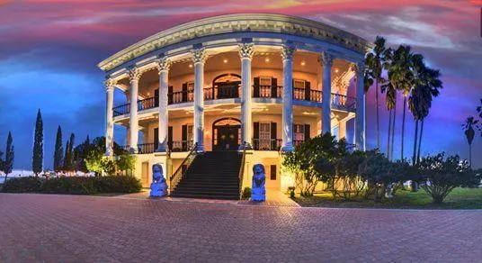 The main home, in a private, gated, walled compound, is a four-level columned mansion with four sides of columned verandas. The main level foyer features marble flooring and a grand double staircase, a dining room with fireplace, music room, library, and an office with marble fireplaces, living room with fireplace, gourmet kitchen with commercial features, including dumb waiter and full bath. The floating staircase is the highlight of a 60-foot three-story atrium, and leads to an entry parlor with inlaid wood flooring, a huge master suite with fireplace and Cherry wood inlaid floors, and all marble his and her baths. There are two guest suites, both with fireplaces, studies, and sitting rooms. The third floor features four guest suites, each with full baths and sitting rooms. Other amenities include elevator to all four floors, intricate moldings, central vacuum, imported gold and crystal chandeliers and approximately 20,000 square feet under roof and 16,000 square feet of living area.