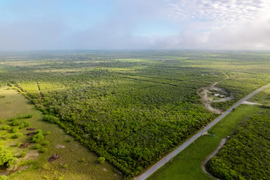 Brush and native grasses typical to South Texas. There is 80 of elevation change allowing for amazing views of the area and a wet-weather creek that contains a variety of trees.