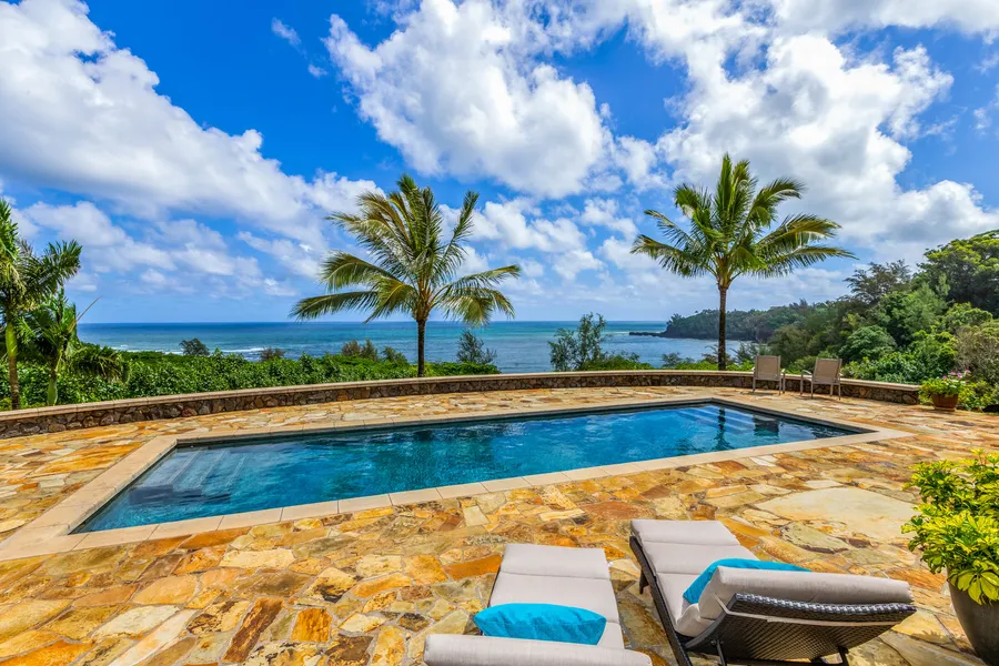 Nestled safely atop the bluff above Kalihiwai Bay, this stunning Ross Anderson designed estate offers breath-taking views unmatched on Kauais North Shore. The 5.3-acre spectacularly landscaped property is serenaded by the gentle sound of waves and features a 4,212SF Architectural Digest main house and a private guest cottage accented with the worlds most exquisite hardwood flooring and luxurious Balinese amenities. A superb resort lifestyle awaits you with multiple lanais, fire pit and a 35-foot saltwater pool for entertaining. In every small detail, the Anini Road estate is designed for island living. You can feel the profound beauty, reverence and solitude of Kauai here, especially beside the peaceful Japanese cemetery that inspires your mind and body to soak in the wonders of this spiritual oasis. This solar-powered retreat is a private sanctuary that provides continuous peace of mind...