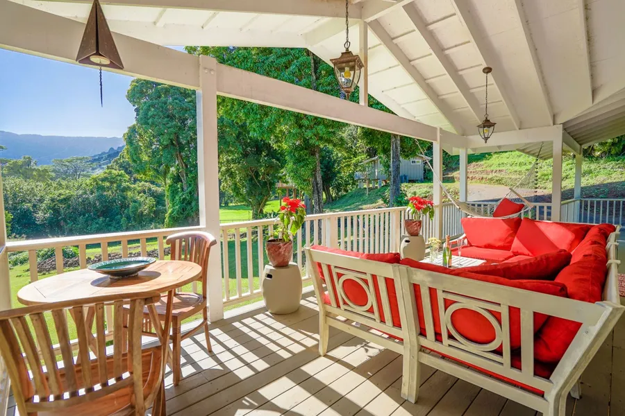 This home and additional dwelling unit offer a view of as many as 8 waterfalls! The yard boasts stunning monkeypod trees. Enjoy exclusivity in this area where residents currently enjoy private-feeling beaches. The beautiful main home has an open floor plan, vaulted ceilings and organic oiled walnut floors. The bright and light kitchen has a farmhouse sink, generously proportioned stone island, gas stove and pantry. The master suite has a double rain shower and double sink. The home has a wonderful lanai from which Mount Mamaloha can be viewed. Additionally there is an 840 square foot downstairs room with windows that could be turned into additional living space if so desired. The additional home has a a farmhouse sink, stainless steel appliances and a rain shower. It also has a lanai. A lava rock retaining wall is in the process of being built. Sellers built this to be their forever home. This home has never had any flooding concerns or similar. Take advantage of this incredible opportunity to buy property in this island's most exclusive up and coming community in a gorgeous lush valley!