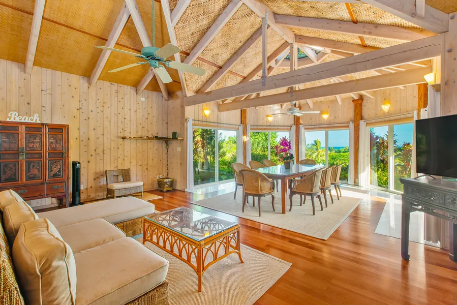 Kauai Gardens is a magnificent vacation rental estate located atop a bluff with breathtaking views of the ocean from every room. This estate consists of 3 spacious en suite bedrooms, each with a separate bathroom and sitting room, a charming 1 bedroom cottage and beautifully finished garage. Each suite can be used with separate entrances and be closed off for privacy, or the entire home can be totally open. In its current layout the home can easily sleep 10 people. This extensively landscaped 1.3 acres is located at the end of a quiet cul-de-sac and is a short walk to the secluded Aliomanu Beach.The stunning main home features vaulted ceilings, and an open concept living area. The large kitchen has granite countertops and stainless appliances. The single level home has numerous skylights, solar hot water heaters, and air conditioning in the bedrooms. There is also an outdoor hot tub with...