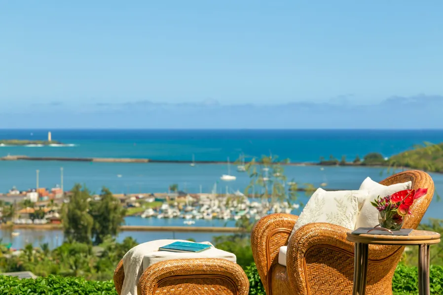Perched atop a dramatic bluff, this impressive, private estate is surrounded by stunning views of the ocean, harbor and Haupu Mountains. Located just minutes from the airport, shopping, dining, golf and beaches and yet set seemingly a world away among only a dozen homes in the exclusive, gated Menehune Bluffs community.