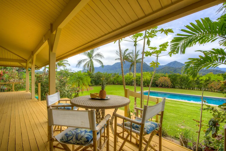 Maybe once, every 20 years or so, a home such as this becomes available. Photos do not capture the feeling you have when you are sitting outside on the lanai gazing at the breathtaking mountains in your front yard. The clouds are constantly moving changing the surreal vistas. It looks like a movie backdrop. At just over 1.5 very private acres, all totally flat and useable, the estate has the perfect pool for your enjoyment. At approximately 1 acre the enclosed backyard has a vast lawn with a variety of fruit trees, perfect for your outdoor celebrations. The outdoor lanai in the front and the back of the home allows for a great variety of vistas and relaxation. The design of the house has complete living including the primary suite on the ground floor with 2 guest areas upstairs. There are well maintained beautiful hardwood floors throughout. The vaulted ceilings make a dramatic stateme...