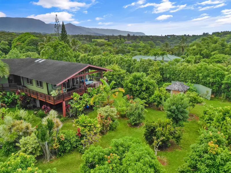 Exclusive, private North Shore neighborhood. This impressive 5 bedroom, 2 story home has an expansive living & dining room w/natural light from skylights & windows surrounding 3 sides. The upstairs-covered Ipe wrap-around lanai hosts distant ocean views & a panoramic mountain view of Bali Hai and feels like a giant. The sunrise & sunset are enjoyed from the outdoor Balinese daybed on the upper lanai cooled by tropical trade winds. The spacious open kitchen has granite countertops, featuring hardwood cabinetry, travertine stone floors & a center island cooking area w/ barstools. The lower level provides a 2nd living room w/multi-stacking doors opening onto a covered lanai w/a lava rock waterfall feature. An outside private covered entrance leads into a 2nd primary bedroom. The spacious downstairs features an additional living room, office area & a den/bedroom w/a fireplace. The yoga/fitness room has large mirrors on one side & beautiful eucalyptus wood floors leading you to an outside spa waterfall area, including an outdoor 2-person lava rock waterfall shower, soaking bathtub & 3 person far infrared sauna. The exquisite 1-acre lot includes mature organic landscaping for privacy, a large organic vegetable garden, very large organic flower garden filled w/ a variety of Hawaiian heliconia, gingers & anthuriums & roses. Other unique artistic features include a detached Bali meditation/yoga/sleeping temple & an additional office or sleeping structure that is single wall construction & all wood, surrounded by large tropical flowers. Beautiful outdoor Sacred geometrically designed fire pit area. The owners have also created a 400 sqft beautiful outdoor screened area/temple that has been created w/ special significance. Completely remodeled. A peaceful oasis that you'll never want to leave. 'All comments, and data are provided by the seller or seller's representatives. Buyer to confirm all and hold all parties harmless from any discrepancy data in the MLS and advertising.'