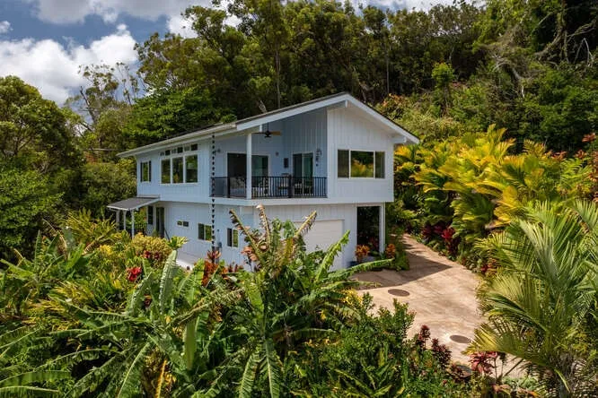 Expansive 180 degree Ocean Views from the living room, dining, kitchen, bedrooms, "office" and lanai await anyone willing to venture up the 1/2 mile long semi-private driveway! Over 2600 SF Total Build Out. Enjoy a plethora of birds, rainbows, even an occasional green flash at sunrise!!! Tropical vegetation reminiscent of the National Tropical Botanical Gardens! Not to mention Fruits and vegetables to keep you healthy. 2 bedroom 3 bathroom home plus Seller holds an ADU clearance form, issued by the County of Kauai to build a 2nd dwelling on the incredible pad above the home. Driveway is already in place. 3.5 acres includes driveway ownership. Two car garage with a large storage room in it. If you love your privacy, this home is for YOU. 15 minutes to Poipu Beach, Lihue Airport, Shopping, Dining, and Golf, yet a world apart! Do not drive up the driveway without a confirmed showing appointment AND Listing Agent Present. Additional photos and 360 Tour linked (film clip icon) above. Home Features: ~Beechwood Manufactured Wood Flooring~Travertine Showers and Floors in 2 of the 3 Baths~Porcelain Tile in the upstairs Primary Bath~Vanity tops are Carrara Marble.~Black Granite Kitchen Countertops~White Shaker Cabinets~Stainless Kitchen-Aid Electric Range, Microwave Hood, Dishwasher~LG side by side Refrigerator~Two sets of Full sized Washer & Dryer~Partially Furnished~Hardie Backer fiber cement Siding for Weather Resistance~Slate Tiled Entryway