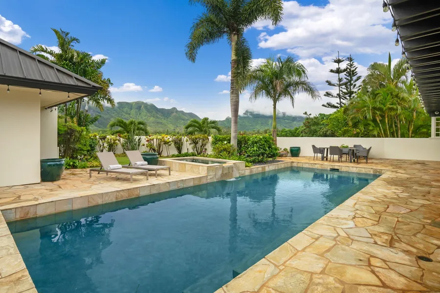 Quartzite flagstone carries throughout. From the driveway to the elegant entry, the pool hardscape, and the complete living areas give this home the rich character to enhance any décor and indoor-outdoor Kaua’i style living and aesthetic. Built by J M Pacific, the home was constructed without bearing walls to support the unique roof structure; many of the more significant walls were engineered with steel framing. Extensive use of glass windows, doors, and walls creates expansive openness in every direction. Owners will not only appreciate but cherish the artistic attention to detail for generations – it is timeless with several hundred thousand dollars having been invested in new glass folding door systems, two new 5-ton Lennox variable speed high-efficiency air conditioning systems with air purification and Mylar air distribution system, two new Daiken mini split units, new insulation in the entire attic, new pool heater, new variable pool pump, new Pentair pool control system. New Savant audio video system, new televisions and speakers. The kitchen and bathrooms have new quartz countertops. New exterior paint. Hydrazzo polished pool finish, spa