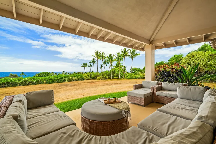The oversized primary suite captures vast ocean views, complemented by a dedicated ocean-view office. Multiple lanais frame Kalalea Mountain, sunrises, sunsets, moonrises, and seasonal whale watching.