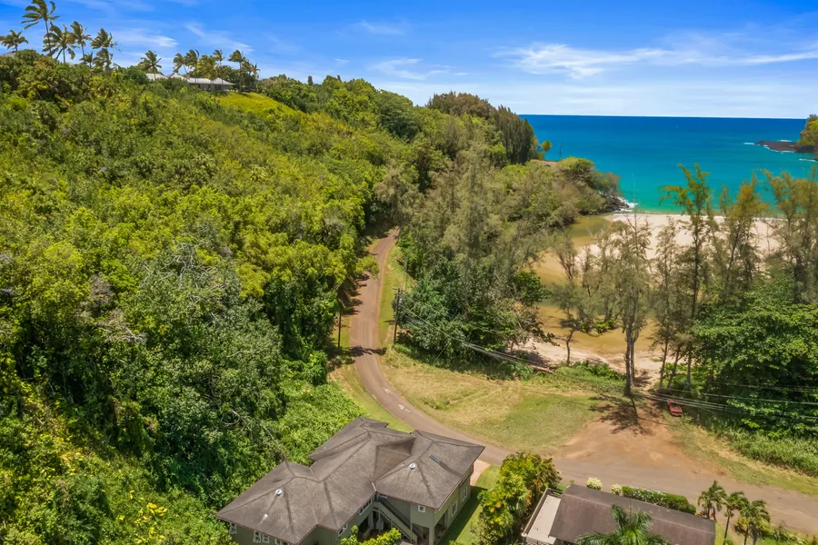 Exceptional quality beach home in an idyllic north shore location! Nestled at the end of a quiet road where the river meets picturesque Kalihiwai Bay. Stroll to the beach for a swim or enjoy a peaceful paddle up the Kalihiwai River to explore waterfalls. Launch a boat, canoe or kayak for a relaxing ocean trip or fishing, and a surfboard for outstanding surf! Expert craftsmanship is apparent in this home of 3,131sqft under roof (inclusive of 586sqft of covered lanai space) all located upstairs with an elevated perspective of the bay and tropical surroundings. Outstanding oversized chef-quality kitchen and formal dining area offer tantalizing ocean views and are connected to a covered lanai perfect for Hawaiian-style indoor/outdoor living. Second living room is it's own defined space complete with a fireplace for ambiance and warmth on cool winter evenings and its own wet bar, half bath an...