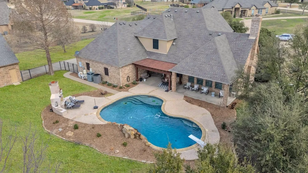 Grandview Estates, an exclusive community with 1 acre+ size lots offers this exceptional 4-bedroom, 3.5-bath home sits on 1.1 acre and offers luxury living with impressive indoor and outdoor features. A grand entry welcomes you with a dramatic rounded staircase and rich hardwood floors throughout the main living areas. The remodeled kitchen is beautifully updated with modern finishes, stainless steel appliances including a under the counter ice maker and food warmer, generous counter space, and an open layout ideal for entertaining. The primary suite offers a private retreat with a spacious bath and separate his-and-hers closets. Upstairs features additional bedrooms and a dedicated media room complete with a wet bar. Outdoor living shines with a heated pool and a stunning outdoor fireplace with full chimney, creating the perfect space for year-round enjoyment. The circle driveway enhances curb appeal and functionality. Car enthusiasts will appreciate the oversized 3-car attached garage plus a separate 2-car detached garage, providing abundant storage and flexibility. This property combines elegance, space, and lifestyle in a desirable Forney location with nearby new developments including HEB, Costco, Target, Home Depot, Lowes, Tom Thumb BJ's Warehouse, a new hospital, and many more restaurants and entertainment, all within 3 miles.