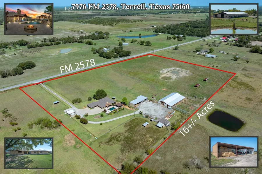 Ranch & animal lover's paradise with an incredibly convenient location less than 30 min to Dallas. Discover country living at its finest on 16 +- AC with this upgraded, modern ranch-style 3-bed, 3.1 bath with office is vacation-like with rock pool, outdoor entertainment space surrounded by lush landscaping, barn w apartment, equipment shed, workshop, storage, gated stone entry, pipe fencing, all ready for your horses, cattle, chickens & exotics. Home features2 spacious living areas, office, granite throughout, large utility room, hobby room or she-shed in the epoxy coated garage & each bedroom has ensuite bath & WIC. Gourmet kitchen boasts sleek SS appliances, ample counter space &copper sink. 4950SF Barn includes 7 stalls with space for more or workshop storage, 1 bed 392SF apartment, tack room, feed room, wash rack, chicken coop, 20 ft overhang & 5 runs. 33x24' 2 bay workshop and 80x30...