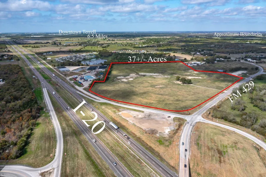 This exceptional 37-acre property is located in Terrell only 30 mi east of Dallas at the hard corner of I-20 and FM 429, offering a prime commercial opportunity. Situated in the second-fastest-growing county in the USA, it features 700 feet of frontage on the I-20 service road and approximately 1,000 feet on FM 429. Daily traffic count of over 58,000, provides excellent exposure to I-20. Located approximately 2 miles east of the Terrell city limits, easy on-off access east or west on I-20. No floodplain according to FEMA overlay. This level tract is ideal for a range of commercial ventures, such as a large truck stop, industrial site, distribution center, self-storage facility, RV and truck parking, and more. The possibilities are extensive, making this property a prime investment opportunity. With its strategic location and high-traffic visibility, this property is positioned to meet th...