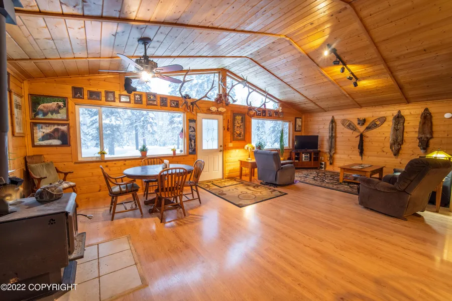 2008 BUILT 1860 SF RANCH w/Quintin Lake access! Concrete siding,wood stove,Corian counters,stainless appliances,vaulted T&G living room on 1.1 private acres. 3 bedrooms+office,pantry,laundry/mud room,arctic entry,walk-in-closet & 2 baths. Detached guest room/studio w/elec & water hook up. 2 sheds,2 canvas carports,wrap around boardwalk & deck. 12x16 Commercial Cooler w/compressor for $3000 on SBOS'