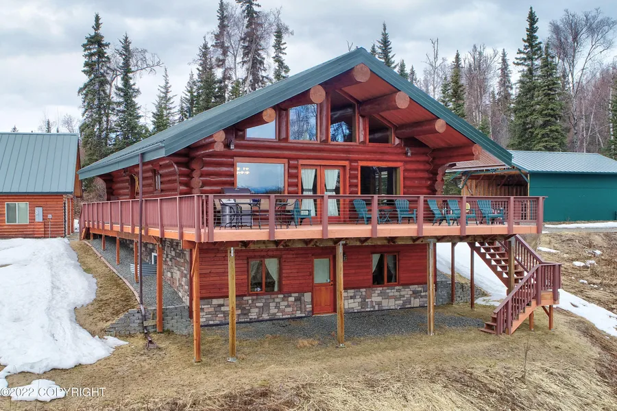 Custom log home with a million dollar view! Huge logs from BC, south facing deck with mountain views, oversized garage with bathroom, laundry and potential guest apartment upstairs. Boat/RV carport, borders 360 acres of native lands. Turn key, most furniture stays. Alaska Living at its best. Moose, eagles and more just outside your window. Super quiet, but 20 minutes to town. Do not miss this one!'