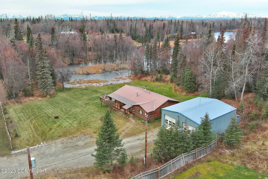 NO NEED TO ''SHOP'' AROUND! Charming Alaskan Log Home on 1.52 acres w/small lake & wildlife. 1200 SF 4 car, heated SHOP! Vaulted ceilings, newer stainless appliances, granite counters, Butcher block & kitchen island. Antique cook stove, wood stove & lake view w/seasonal ducklings. Master has walk-in-closet, full bath +nursery/office. Walk-out bsmt w/rental possibilities. Unfinished bonus 3/4 bath new parts included for buyer to finish. 2023 new pellet stove downstairs. 2019 cleaned & serviced YORX gas furnace-Preferred. 2020 new Hot Water Heater-Preferred. 2023 New Water Softener. 12x12 timbers for future new deck stay. Current deck is as-is. Buyer to verify all info. Snow blower stays! 2022 JOHN DEERE riding lawnmower stays for full price!