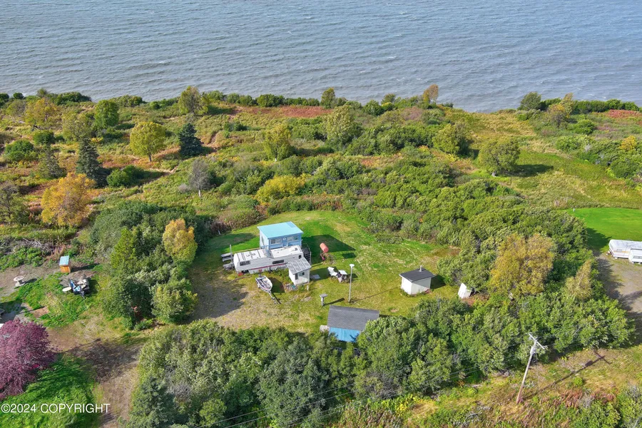 LOVELY MT REDOUBT & INLET VIEW LOT of 7.66 acres-goes to mean high water line. 2003 built cabin w/Toyo fuel oil heat,1989 5th wheel, bunk house w/woodstove, lg shed, Bath house w/washer/dryer. Well, septic, power, large parking area w/room to build +lower flat area PERFECT for a DREAM HOME! Driveway is shared w/neighbor & is not maintained. Summer only at this time, As-Is. Water line not buried.
