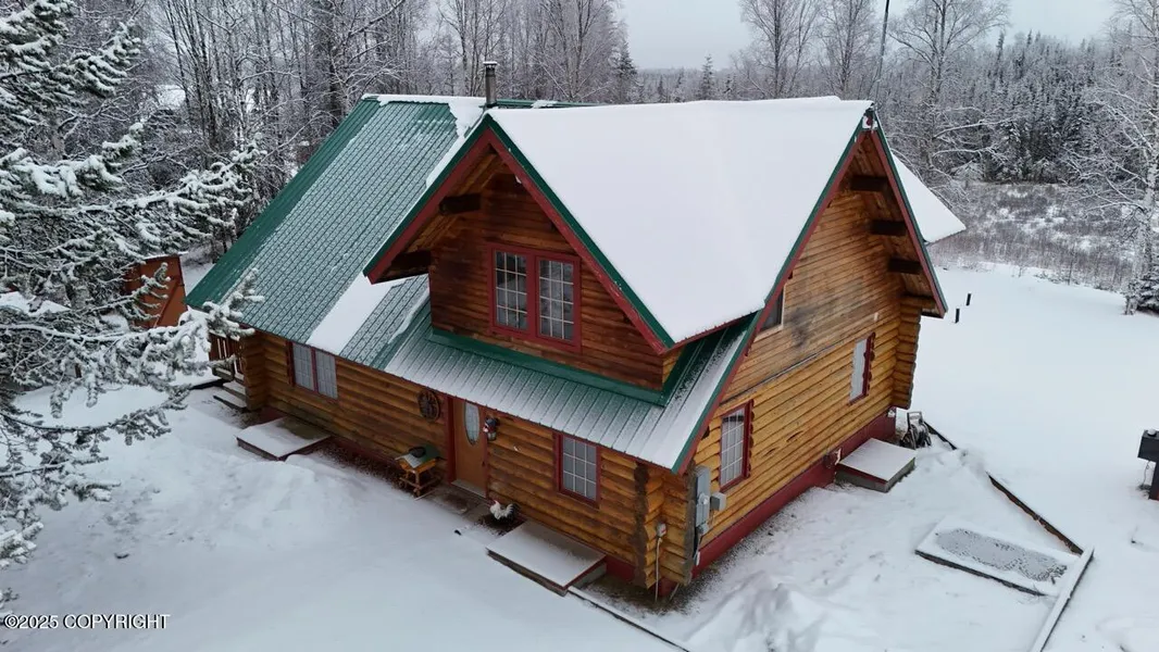 Live on the grid with an off the grid lifestyle on this private sprawling 9.1-acre piece of a homestead. This log home combines rustic charm with modern conveniences with 5-bedrooms, 2.75 bath, living room/family room/upper-level loft, cold storage/root cellar, impressive theater room, a spacious and well-equipped kitchen, and fully finished basement. So much to appreciate in this home with vaulted cathedral ceilings, exposed wood beams, wood stove, recently updated bathrooms, luxurious jacuzzi tub and a walk-in shower. Outside, enjoy the tranquility of a large backyard, wood style boiler, large woodshed, 2 chicken coops, large deck, a custom built smoker, shed for extra storage, new metal roof, workshop, circle drive with two heavy duty gates for privacy, and plenty of wildlife to observe. Don't miss out on owning your own slice of paradise in the Great Land, call today so you can see it for yourself!
