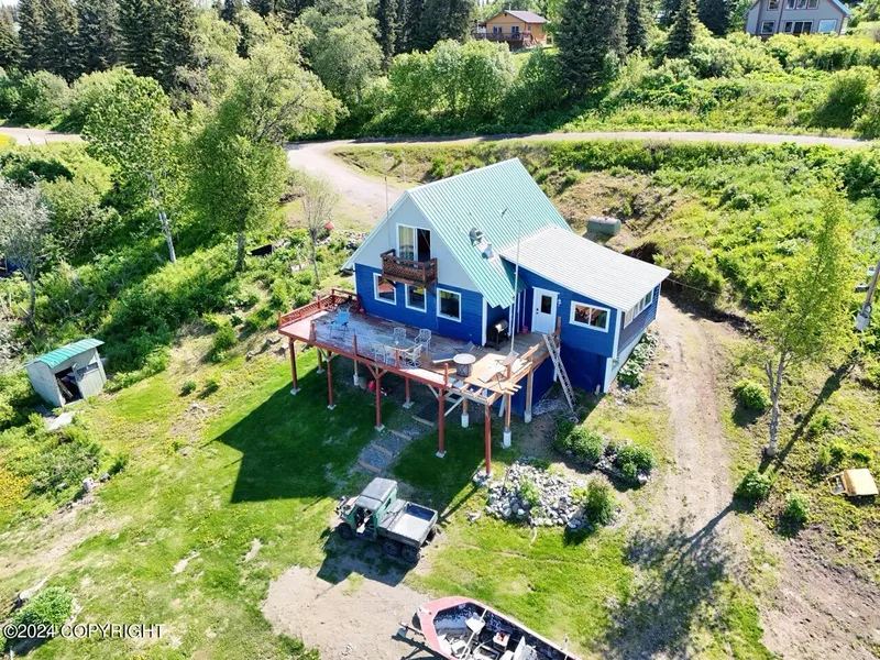 3 million dollar view!! Mts Iliamna, Redoubt AND Spurr are in your living room! A 1.55 acres w huge lawn, 40' conex, and room for RVs, boats, or a future shop. The home has 2 bdrms and 2 baths up top, and a separate entrance apartment/living space downstairs with a full bath and kitchen area. There are a few fixer upper items, including updating/replacing the deck. Priced accordingly to sell.