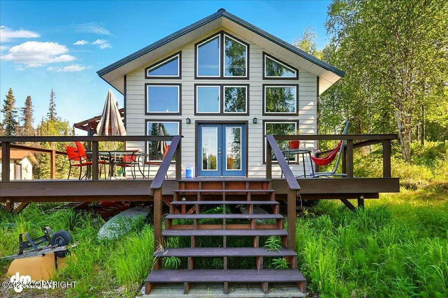 TRANQUIL LAKEFRONT SETTING of 2.14 acres on stocked Ashana Lake. 2018 built, 3 bed, 2 bath cozy chalet w/cathedral vaulted ceilings & large windows to your picturesque view. Expansive Trex deck w/Southern Exposure. Entire upper level is primary suite. Detached, heated garage of 576 sf w/covered boat storage. RV spot w/hookup & dump. Winding path to the water's edge, firepit & floating dock.