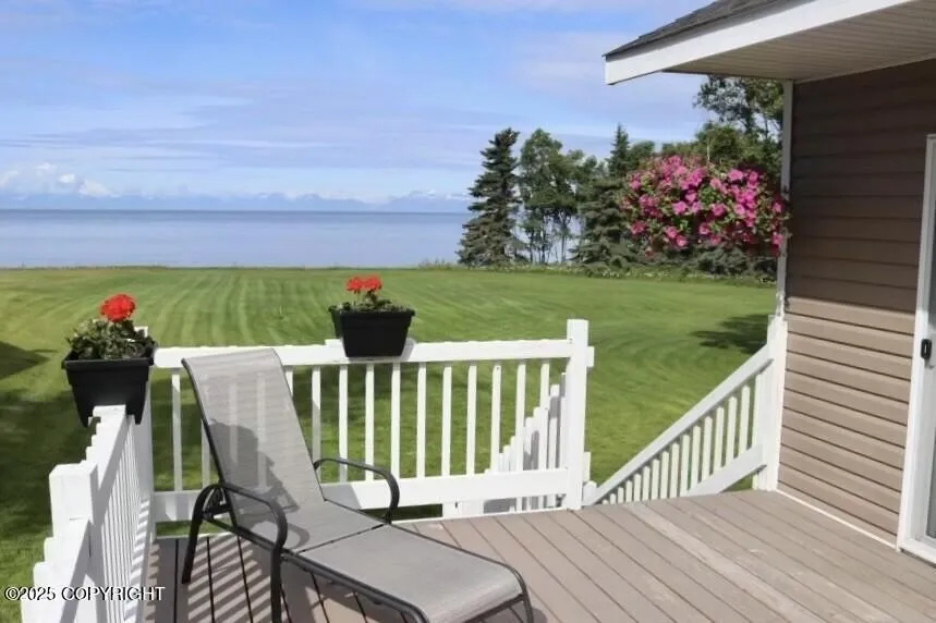MOTIVATED SELLERS! UNOBSTRUCTED VIEW of Cook Inlet and mountains! Enjoy the tranquility of this well maintained home and manicured property. Valuted ceilings with big windows, 1 Office/bdrm/bath upstairs 2 bedrooms & bath down. Large deck and a ''She-Shed'' Treehouse w/a view! Paved drive w/heated apron & sidewalk. Stable bluff, excellent water, great wildlife viewing. Come See!