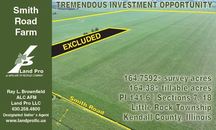 The Smith Road Farm is a 164.7592 surveyed acre (164.38 FSA tillable acres-estimated) farm in Sections 7 & 18, Little Rock Township, Kendall County, Illinois. This highly productive farm contains Class A soils with a PI of 141.6. There are no buildings.