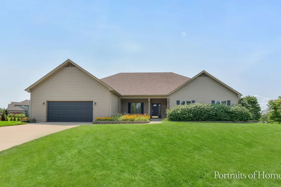 Custom Built sprawling Ranch home on tranquil 1.2-acre lot. Home sits in quiet cul-de-sac, covered front porch with views of perennial flower bed. Meticulously cared for inside and out. Move-in ready home features a dramatic open floor plan with vaulted ceilings. Over 2200 sq ft on main level features 3 generous bedrooms, 2.1 baths tons of closet space. New remodeled Kitchen with updated Custom cabinets with soft closing drawers, quartz countertops, SS appliances, tile backsplash, new lighting and hardware. HUGE center island; Prepared to be Wowed! Spacious Mud/laundry room with storage. Great Room has beautiful views of lush backyard landscaping. Primary bedroom with private spa-like bath featuring double sinks, walk-in shower, lots of closet space in the walk-in closet. Full finished basement adds another 2000 sq ft of living with another two bedrooms, full bath, rec room, game area and lots of storage Oversized three car tandem garage (tandem has 47 feet for all the toys to be stored). New items: 2024 roof, hot water tank, Washer & Dryer. 2023 New carpeting. Interior all freshly painted. 2022 new Water filtration system added. New thermostat installed. So much more, including windows, exterior Hardie board Siding, exterior lighting; see additional info for list. Enjoy the area with walking paths, ponds and all the nature nearby.