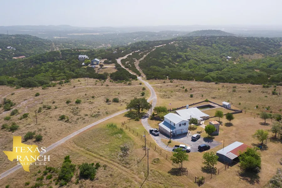 A paved road leads straight to a two-bedroom, two-bathroom rock home on the property with 360-degree views. It features a window-wrapped porch and a rock wall that surrounds the front of the home. Mature Live Oak trees surround the home, giving it peaceful seclusion. There is also an attached garage with guest quarters upstairs that offer one bedroom and one bathroom.