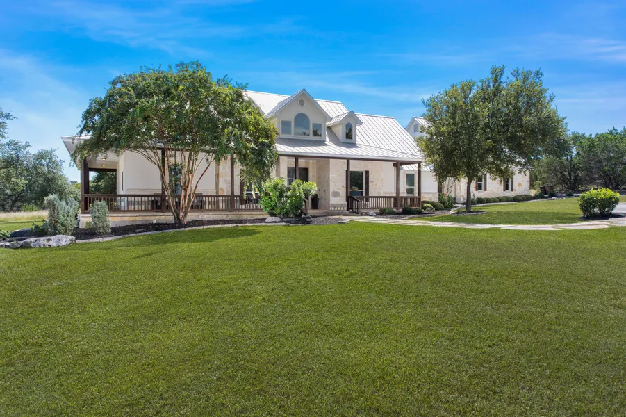 For those craving a luxury retreat that features distant horizons and beautiful landscapes, this exquisite estate, perfectly situated on 3.75 exclusive acres, offers a balance of sleek design and stylish, sophisticated country living. The home was carefully designed to integrate an incredible indoor floor plan with an impressive outdoor living experience, ideal for the splendid year-round Texas weather. Beyond the foyer, soaring ceilings, oversized windows throughout, and the statement wood beams characterize the home's refined interiors. It flows to the living and entertaining spaces, including a formal dining room with a view of the front yard, a spacious office with a built-in bookcase, and a relaxed yet tasteful living room that features a custom entertainment center and overlooking views of the countryside backyard. The uniquely oriented kitchen includes an oversize island with seating, stainless steel appliances, and a custom wooden vent that contrasts stylishly with the white counters and walls. The sunny breakfast area features a custom bar and prep counter with views of the backyard through the large windows. The expansive primary suite provides the ultimate retreat with peaceful views, a lavish en suite bathroom indulges with a walk-in shower, a soaking tub, and dual vanities. The residence also offers a media/game room, a spacious screened-in porch, a wrap-around porch with a summer kitchen and fireplace, and additional private guest quarters. Beyond this extraordinary one-of-a-kind estate, relish the resort-style living within Cordillera Ranch that includes amenities such as, the Jack Nicklaus Signature Golf Course, the exclusive Country Club, a private Guadalupe River park, trail rides that you can enjoy on horseback, hiking, or biking, or enjoy the river in a tube or on a kayak. Consummately accommodating, exceptionally comfortable, and appropriately refined, this home will stand the test of time.