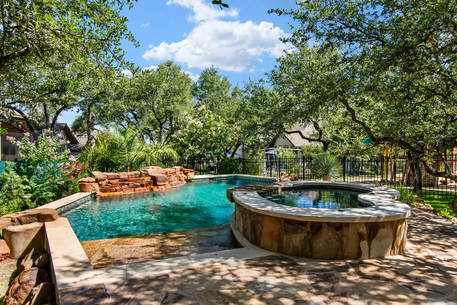 This impressive stone and stucco dream home boasts an oversized three-car garage with custom epoxy floors. The open floor plan has soaring wood beamed ceilings with extra large windows allowing for the flow of abundant natural light. Dark walnut wood floors are throughout the house. The Chef's kitchen is equipped with commercial-grade KitchenAid appliances, double ovens, and massive amounts of storage, workspace, and cabinetry. Feel the peacefulness of the oversized Owners retreat with a private spa-like bathroom, two walk-in closets, custom glass vessel sinks, a large soaking tub, and a beautiful large shower with frameless glass. Along with four bedrooms, there is extra room being used as an office that offers flexibility to work from home with inspiring views of the pool.