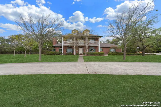 Discover unmatched luxury and secluded privacy within this wonderful colonial-style home. With curb appeal like no other, this home boasts a circular driveway and large columns that accent the downstairs porch and the upstairs balcony. Situated on two acres of breathtaking scenery and exceptionally large live oak trees, this home is a rare find. The interior offers spacious, bright, and fresh living, with a living room, private study, formal dining room, and a wonderful den with a wood-burning fireplace. The kitchen has been recently updated with quartz countertops, a new cooktop and a modern backsplash. The secondary bedrooms are all found upstairs, giving the primary bedroom extra privacy, and feature spacious rooms for all your personal touches. For movie and game nights there is an excellent flex area on the second floor. The backyard is your own private oasis with a fabulous pool and spa area. Only a short drive to Highway 46, this home offers seclusion while still offering fantastic shopping and dining and easy access to San Antonio, Boerne, and Spring Branch. Make this stunning home yours today!