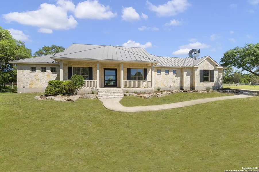 This exquisitely renovated single-story home is nestled on 5.14 acres with beautiful century old oaks! A charming meandering walkway leads to the front entrance, where custom exterior shutters elevate the home's curb appeal. Every inch of this transitional residence has been thoughtfully designed with impeccable attention to detail, featuring high ceilings, clean lines, and contemporary finishes throughout. Newly appointed finishes include wide-plank light hardwood flooring, designer lighting, decorative chandeliers, and custom hardware. Every aspect of the home has been meticulously upgraded, from the plumbing, including provisions for a water softener, to the soft-close custom cabinetry. The welcoming foyer, with its striking iron and glass pivot door, ushers you into the heart of the home. The great room features a soaring vaulted ceiling, anchored by a designer chandelier and a floor-to-ceiling stone fireplace that serves as the room's centerpiece. Flowing seamlessly from the living area is the dining space, which connects effortlessly to the chef-inspired island kitchen. This open concept layout enhances both functionality and style, creating an inviting atmosphere perfect for both entertaining and everyday living. The gourmet kitchen features quartzite countertops and top of the line Thermador appliances, including a 5-burner gas cooktop, built-in oven, microwave, and dishwasher. A convenient breakfast bar, a spacious pantry, and sliding windows opening to the screened-in patio making it ideal for both cooking and hosting. The primary suite is a private sanctuary designed for ultimate relaxation. A stepped ceiling adds an architectural touch, while the cozy window seat overlooks the beautifully landscaped backyard. With direct access to a private covered patio and an enclosed side yard, the space offers a serene retreat at the end of a busy day. The spa-like bath is equally luxurious, featuring a dual sink vanity with quartzite countertops in striking black and gray tones. The expansive walk-in shower is a true masterpiece, with dual seamless glass doors, dual rainfall showerheads, and a handheld extension for a truly indulgent experience. The home also includes two additional bedrooms, one of which could serve as a private study, as well as a utility room equipped with a sink and space for a refrigerator. The tranquil backyard is a paradise for outdoor living, offering a wraparound screened patio with a floor-to-ceiling stone fireplace and versatile spaces for lounging, dining, or playing games with family and friends. Overlooking the park-like grounds, the patio creates a seamless connection to nature, with mature trees and shaded canopies that provide a peaceful ambiance. A charming original ranch stone water trough and decorative windmill add rustic appeal to the landscape, while the expansive lawns are perfect for both leisure and play. This stunning property has been thoughtfully and tastefully reimagined, offering an ideal blend of modern sophistication and natural beauty. Conveniently located near the main entrance and clubs area, it offers the perfect opportunity to experience the serene luxury of Hill Country living.