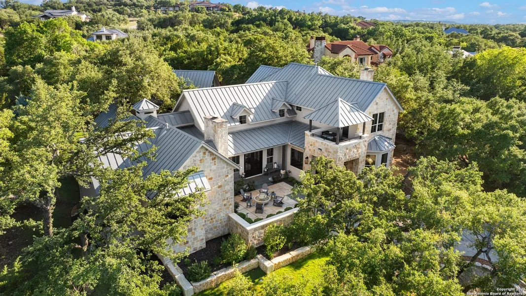 Master Golf Membership Available for Purchase! Experience the epitome of modern elegance with transitional contemporary architecture that seamlessly blends sleek lines, warm textures, and tones. Every detail has been thoughtfully designed and executed. Upscale amenities include natural honed block limestone flooring, exposed wood beams, designer chandeliers, modern hardware and fixtures, quartzite counters, four fireplaces and smart home components. The entertainment enthusiast will appreciate the indoor and outdoor spaces - which are ideal for gatherings on any scale! The main living area opens to the front terrace views that overlook the well known Twin Sisters Peaks! From morning coffee to afternoon libations with friends, you will appreciate the hill country landscape and scenery! The gourmet kitchen boasts all your quintessential needs for preparing your favorite meals! Appointments include an expansive island, level five quartzite countertops, professional Thermador stainless steel appliances, gas cooking, Scotsman ice-maker, detailed backsplashes and a plethora of workspace which all cohesively blend to create a culinarian masterpiece! For added convenience, the kitchen features an adjacent bar with a Thermador wine refrigerator, plus a spacious walk-in pantry with a home management center and coffee bar. Just beyond the kitchen is the grand dining room with another stellar view, ideal for elaborate dinners and holiday gatherings! For relaxing meals, there is a cozy breakfast nook that overlooks the park-like backyard. The primary suite is a sanctuary of indulgence offering sweeping views, a sleek seating space with seamless glass windows, a hand-scraped limestone gas log fireplace and dual custom wardrobe rooms designed by Inspired Closets. Reminiscent of a luxury hotel, the spa-inspired bath is complete with separate vanities, garden tub and a seamless glass shower with multiple shower heads, including a rain shower. A guest suite, mudroom, spacious utility room with custom finishes from Inspired Closets and a boutique style powder bath complete the main level. The upper level boasts two spacious bedrooms and an expansive game room with a distressed wood ceiling treatment and beams, wet bar, Thermador beverage cooler and a covered balcony overlooking the hill country. The well-equipped outdoor living spaces encompass two spacious covered patios. One with a gas grill, gas log fireplace and cozy sitting area and the adjacent patio is ideal for al fresco dining. Both patios overlook the serene backyard complete with towering mature trees. The garage enthusiast will appreciate the oversized, three car garage with plentiful space for your vehicles and much more! Finishes include epoxy flooring, a walk-in storage room, dedicated workshop complete with a sink, workbench, shelves and room for a refrigerator. Additional features include a lawn-equipment room and a finished out walk-in attic with generous floored storage space that could be transformed into an exercise room or guest quarters. Come immerse yourself in a refined hill country lifestyle with the added convenience of being just a short golf cart ride away from The Clubs of Cordillera Ranch!