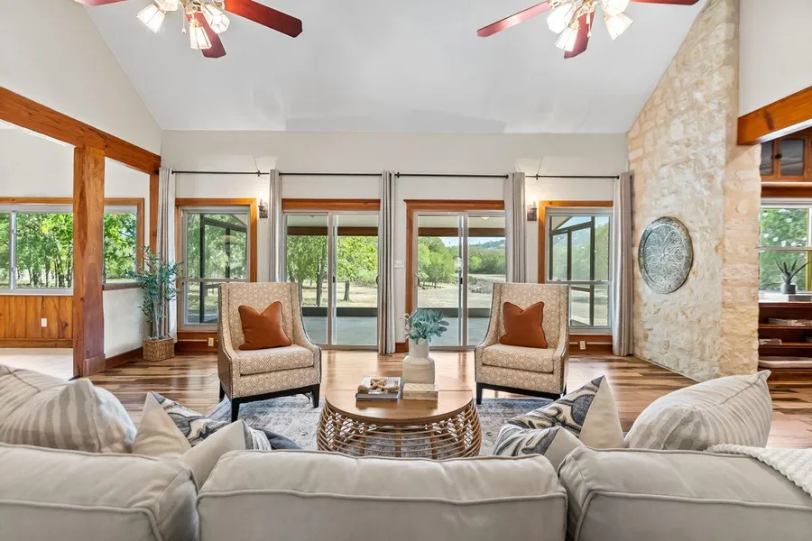 Incredible legacy ranchette located just minutes from downtown Comfort is everywhere you want to be. You will notice the unique and special features of this home from the moment you step inside. The cathedral ceilings with hand crafted wooden beams rise high over the living room and invite the open concept of the living, dining, kitchen and cozy family room complete with stone fireplace. Custom cabinetry from sourced wood, interior masonry, antique doors, huge amounts of storage including two large dual primary closets and a recently renovated primary bathroom add to the features. You can work from home in the luxuriously oak appointed office while simultaneously enjoying the peace and serenity of the Hill Country. There is also outdoor living abound with the covered and screened in porch allowing you to catch the breeze while watching the many deer, turkey and other wildlife that cal...