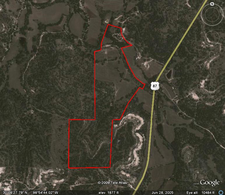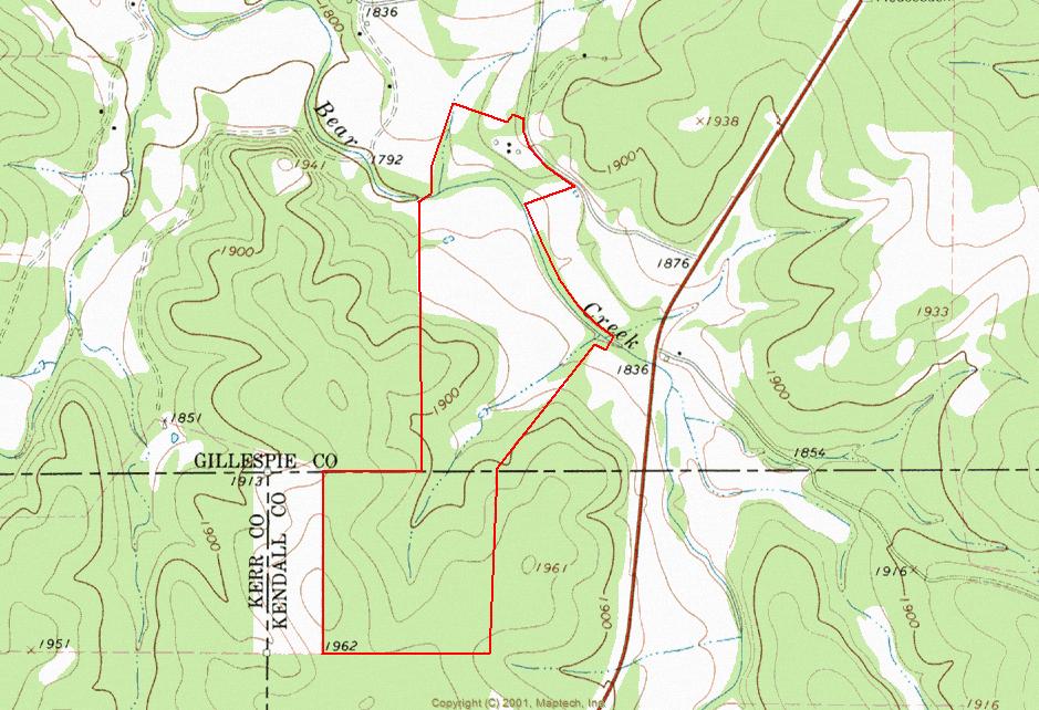 Description: This ranch has approximately 2700 hundred feet of both sides of Bear Creek and several waterfalls which make it true Texas gem. The ranch has good roads and great views of the surrounding county. A perfect hunting and recreational getaway loaded with an abundance of native game, as well as, an occasional blackbuck antelope. A wide variety of oaks cover the ranch.