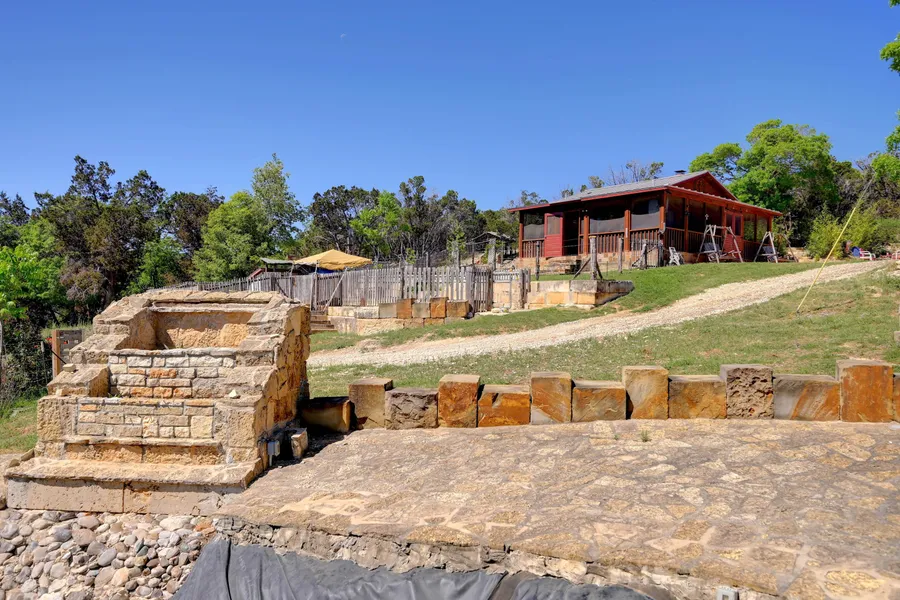Amazing Unicorn Property!!! 18 +/- Unrestricted acres with huge views and wet weather creek. Massive Sycamore Trees and Large Oaks abound on this hidden gem of a property. Owners are stone masons and lots of amazing stonework has been done on the property. Everything is extremely well built. There is a cozy cabin to stay in while you build your forever home. Two car detached garage with lift rack. There is a chapel built from solid 2'x4' limestone blocks that is just amazing. Several outdoor kitchens on property. Wood fired Pizza Oven, numerous fountains and patio areas to enjoy the views and Hill Country. Two Ponds with Coy fish. Electrical and water lines have been installed all across the property. There is also a foundation for a forever home that was started.