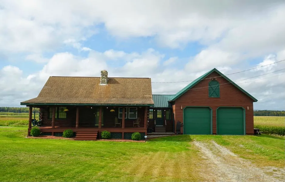 As soon as you walk into this beautiful log cabin your eyes are instantly drawn to the log beams, natural stone fireplace, and tall cathedral ceilings. Oversize insulated garage with plenty of room for storage and work space. Great location with this property. Quiet yet close to interstate for easy commute. The home has been recoated with stain and sealant!