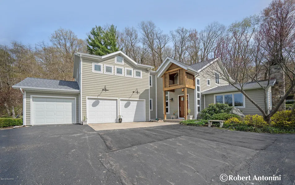 At the end of a long sweeping driveway and perfectly situated on 3+ acres you'll find this immaculate 4 bedroom, 4 full bath beauty in Forest Hills Eastern Schools. Completely taken down to the studs in 2002 and over 2,000 sq ft of new construction was added creating the beautifully finished 4,700+ sq ft home you see today. A fabulous home for entertaining both inside and out! As you enter the dramatic 2-story entry you'll love the custom entry door and custom staircase with ironwork. The great room boasts vaulted ceilings with original beams and French door access to the backyard haven. The cozy woodburning fireplace adds beauty and warmth to this room and you'll love the passthrough feature from the kitchen for entertaining! You'll enjoy the warm glow of wood floors throughout much of